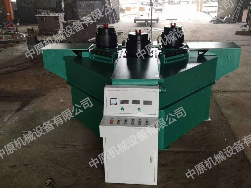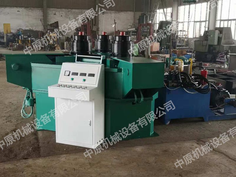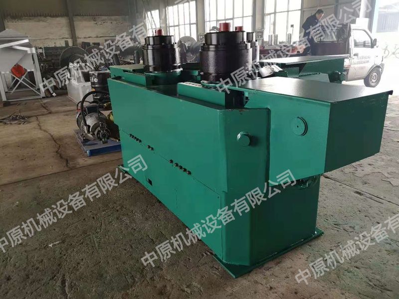 該機為叁輥型材卷圓機,集機電一體。電機輸出的較高轉速通過傳動裝置(聯(lián)軸器,液壓馬達,液壓油缸,齒輪等)轉換成所需的大扭矩低轉速,帶動兩主動輥實現旋轉運動,為型材行走提供扭矩。兩個主動輥中心距可調,被動輥通過液壓油缸前進、后退實現位移,來控制直徑大小。三個工作輥成等腰三角形分布,通過調整移動輥實現這三個點形成的弧線達到所需彎曲半徑,借助被動輥的壓緊及兩主動輥的旋轉運動,使型材經過多次連續(xù)彎曲,產生永久性塑性變形,用于常溫狀態(tài)下將型材卷制成圓形,弧形等工件。
